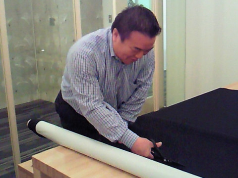 その生地を、チョキチョキと切っているのは、手帳カバーの製作でお世話になっている、伊勢丹の籠浦さん。