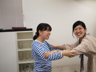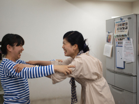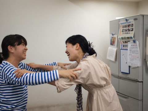 腕をつかみあってきゃあきゃあ叫んでいます。