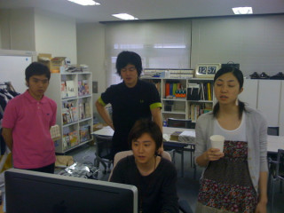 「明日の販売に向けて 準備をしているんですが、 ふたつの販売ページに この3人のデザイナーが 複雑にからみあって関係してるので、 ちょっと話し出したら全員が 集まってきちゃったんですよ、とほほ」