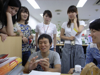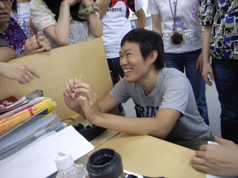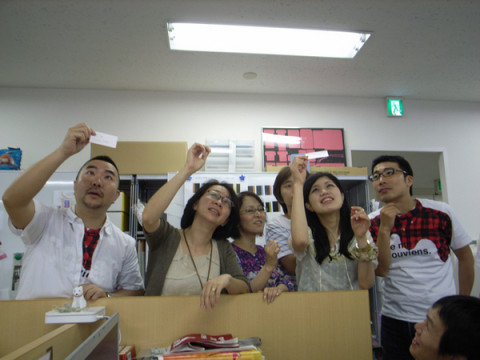 「名刺」ときいた瞬間じゃんじゃんと人があつまりまして、試作品を手に取って、なぜか変なポーズで見つめるのです。
