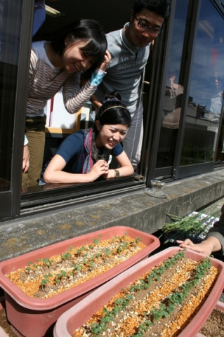 元気に育つ。 「SUPERVINTAGE」の〈今日の廿日大根〉、ご覧いただいてます? Tシャツチームの Tシャツの追加販売がはじまるころに、収穫予定なんですって。 ちょっとね、たのしみですよねー。 本日の東京は夏を思わせる快晴。 ベランダの廿日大根は、ちいさな緑の葉っぱを開いています。 かわいいなあ。 お、みんな集まってきた。 みんなで集まって誰かんちの赤ちゃんを見ているみたい。 「見つめてやると育つんだよ」 廿日大根の様子は毎日こちらでお伝えしています。 ぜひみなさんも、 「見つめに」いらしてくださいね! ぶじ、育ちますように!! 2009/07/07 15:37 |
