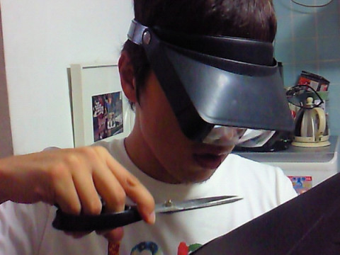 右側は、ちょっと珍しい拡大鏡をかけて手帳カバーの飛び出た糸を真剣に切っている