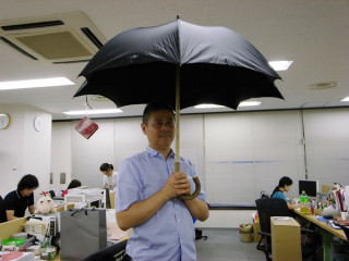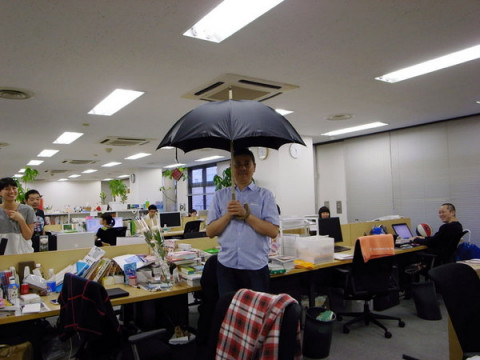 部屋の中で傘をさしてたたずんでいるのは、今日の社長ちゃん。