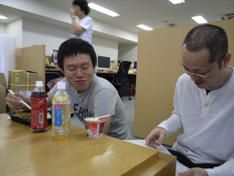 食べながら。 こちら、黄昏チームでございます。 ただいま、WEB製作ならびに、書籍製作についての細かい打ち合わせを致しております。 帯、後書き、奥付、イラスト、予告編、部数決定、音楽使用問題、入稿日確認など、 「決める必要のある項目」がたっぷりあります。 話をすると、あれもあったこれもあったともりもり盛られていくのです。 もりもり議題が盛られていくなか、 弊社では、時間を有効活用するため、会議中にお弁当を食べることは禁止されていません。 しかしながら、 「ランチミーティング」というような格好のいいものでもありません。 2009/08/05 14:00 |