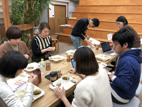 ひな壇の前の広いスペースで、 ほぼ日手帳の製作チームがみんなでカレーを食べながらわいわいと打ち合わせをしていました。 (写真をとった瞬間が悪かったのですが、話が盛り上がって、とてもたのしそう) 「ほぼ日手帳2019」の製作うちあわせだそうです。 手帳チームの 「‥‥あ、ふたり、ちょっと」 と呼ばれたので (あ、もしかしたら自分たちの分もカレーがあるの?)とたいへん期待しましたが、開口一番、 「あ、いや、カレーはないんだけどね」 と言われ、とても真面目に仕事の話をされました。 ちょっとだけ残念でしたが、 「ほぼ日手帳2019」 どんなカバーができるのか、いまからとてもたのしみです。 今日のお昼は外にカレーでも食べに行こうかな、と思います。 2018/02/22 12:20 |