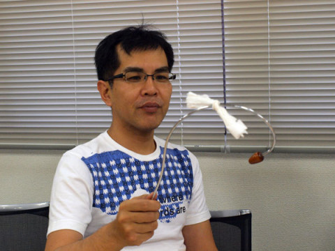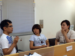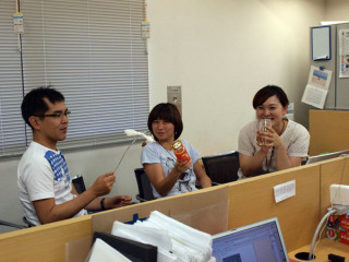 それは何? もと「カフェテーブル」で、ぼそぼそぼそという音声ながらも、たのしそうなミーティングがおこなわれています。 ハラマキミーティングですね。 カメラを向けると、サービス精神旺盛なこの3人、それぞれ手に持っているものをさし出しとっさにポーズのようなことをしはじめました。 だけど、山下さんの手にしている、それはいったい何? 「‥‥‥‥」 肩こりほぐし棒? 自分でもなぜそうなっているかは不明? ほぼ日ハラマキは、9月1日発売予定です。 2009/08/27 17:32 |