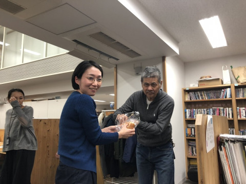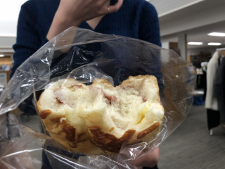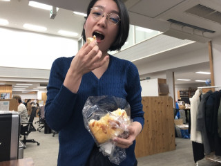 それを社長に。 打ち合わせが終わって、フロアにおりてきた 「なんかパンの香りがする」 たしかに言われてみれば、パンのいい香りがします。 誰かが言いました。 「そういえば たしかに、はっとりさん、さっきパンを食べていた気がします。 ‥‥と、 「あ、そうなんです、そうなんです」 と言いながら しわくちゃのビニール袋に入っています。 ええと‥‥なんというか、岩みたいな? その見た目、食べかけにしてもひどくない? と、見ていると 「わたしこれ、大好きなんですよー」 と言ってパクパク食べてみせ、そのまま 「あ、召し上がります?」 と差し出しました。 ‥‥え、その残骸を社長に? ちぎって食べているからきれいっちゃきれいとは言え、同僚にあげるのにも躊躇する見た目だわ‥‥。 しかしそこは食への好奇心が旺盛な 「これはきっと焼いたほうがうまいね」 と、非常に正直な感想を言って、去っていきました。 2018/03/02 18:49 |
