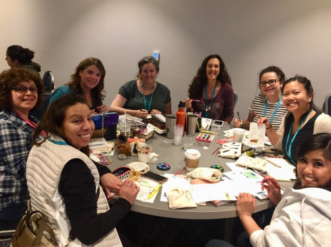ワークショップ 以前、ほぼ日にも登場してくれた エイプリルさんが、ほぼ日手帳を使ってワークショップをしてれました。 事前に申し込みを受付けたところ、なんと、定員の200人を大きく越す申込みがあったそうです。 大部屋にぎゅうぎゅうにつめこんだ椅子に座って、エイプリルの話を真剣に聞くみなさん。 後半は、ほぼ日手帳に自由に書き込む時間が用意され、みんな、手持ちのペンやマステを使ってページのデコレーションをしていました。 どのテーブルもみんなすぐに仲良くなり、わいわいと盛り上がっています。 「大人になるとなかなか新しい友達はできないものだけど、ほぼ日手帳が好きって言うだけで一瞬で仲良くなれるなんて、アメージングよね。」 と、言ってくれた人もいました。 2018/03/05 06:09 |