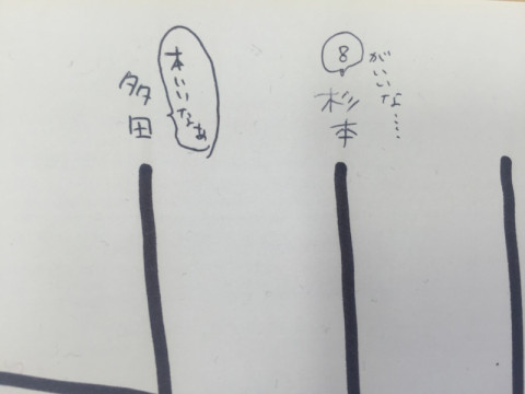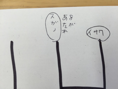 いくつか素敵ないただきものがあり、だけど全員分はない、という状況のもと、担当者があみだくじを作って、ここに置いたのです。