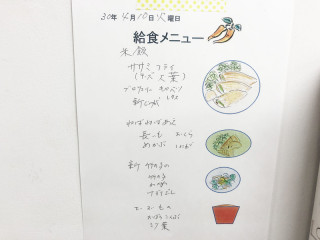 今回レポートを忘れてしまった給食メニューですが、そういえば絵に描いたものが貼ってありました。