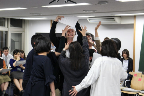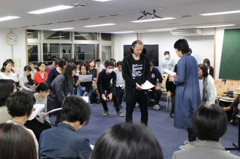 カクシンハン ほぼ日の学校シェイクスピア講座折り返して後半始まりの講師は演出家・木村龍之介さん。 「ハムレット」公演を終えたばかりの、河内大和さん、真以美さん、岩崎マーク雄大さんと共に、99席クラス全員を劇団員にしてしまいました。 400年前に書かれたものでありながら、現代のものとしてどこででも再現できるシェイクスピアの世界。 それはまるで魔法であるかのようだ。 木村さんの講義は、そんな言葉から始まりました。 たしかに、今宵、99人の上に魔法の粉がふりまかれたようでもありました。 デンマークのエルシノア城に吹く冷たい風をみんなで作り、手だけで亡霊をイメージしました。 木村さんの持論でもある 「ひとりひとりのシェイクスピア」を自分に引き寄せながら、個人的なイメージをつくり、それをみんなで話し合い、そして最後は、マクベスを追い詰めるバーナムの森を体で表現しました。 わずか5分のディスカッションとはとても思えないほど、受講生のみなさんの議論は深まって、多彩な森の姿が立ち上がりました。 想像力のすごみを改めて感じる一夜でした。 2018/04/24 22:10 |