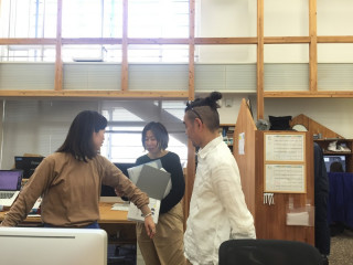 をはじめ、通りすがりのみんなが興味津々で生地をさわったり質問したりしている、そんな午後です。