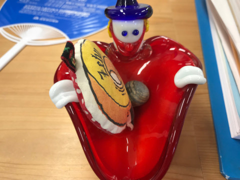 (私のピエロはこれからバウムクーヘン部の勲章と思い出の石を、永田さんのピエロはこれから印鑑とミントを持つ役目)