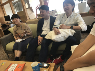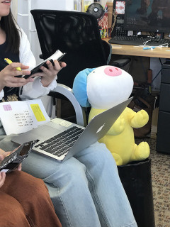 デザチーの朝会 デザインチームは、毎日11時半からソファ席でミーティングをしています。 「今日わたしはこんなことをします」 「あの仕事がやばいので手伝って!」 などを共有する会です。 それぞれがバタバタしていてここのところ出席率が低かったのですが、今日はいっぱい集まりました。 ブタフィーヌさんも出席で、椅子がギュウギュウ。 6月のたのしみ展と創刊記念日に向けてだんだん仕事が詰まってきましたが、ウクレレをひいたりお菓子を食べたりと明るくスケジュール調整中です。 力を合わせてがんばるぞー! 2018/05/15 12:10 |