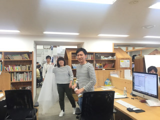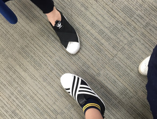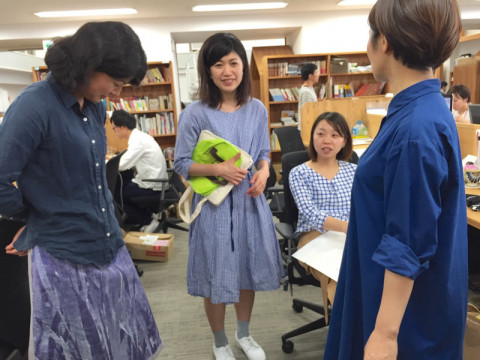 わあっと場がわいていたので、なにかと思えば、 このときのお母さん当てクイズでも、けっこうな混乱をまねいたコンビで、 にしだのお母さんを、いのうえのお母さんだと思った方、たくさんいたみたいです。 (私もそのひとり! ちなみにお母さん当てクイズの解答はこちら) すると、 「私たちも今日は靴がおそろいなの」 と そうか、色違いだけど、おそろいですね。 あれあれ、というか、今日みんなブルーを着てない? ということでブルーかぶりも発覚して、なぜか記念写真を‥‥。 たのしみ展前で極まっていても、こんなことだけで盛り上がれる社内は、なかなかいいなあと思います。 それだけの投稿ですみません。 2018/05/17 16:32 |