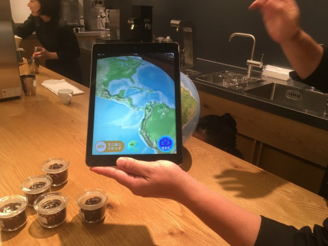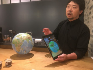 ほぼ日のアースボール! 先日、 それは天王洲にある、アートフォト専門のギャラリーIMA gallery。 ここにはプレミアムなコーヒーを提供するギャラリーカフェIMAcafeが併設されています。 おしゃれで素敵な空間の、クールなカフェカウンターのはじに見えるのは、おお、あれはほぼ日のアースボール! コーヒーマイスターの中川亮太さんに、それはおいしいコーヒーを入れて頂きながら、アースボールをどんな風に使ってらっしゃるかをお聞きしましたよー。 コーヒー豆がどんなところで栽培されているのか、それがどうしてなのかを説明するのに、軸が無くて気軽に扱えるアースボールは、とても使いやすいそうです。 とくに気に入っているコンテンツは、標高差を100倍に強調した地球を見ることができる 『でこぼこ地球』だそう。 「昼は暑い、朝晩は寒い。 これがおいしいコーヒーが取れる大事な条件です。 つまり、暑い国の、標高が高いところが、 おいしいコーヒーが取れるんです。 アースボールの『でこぼこ地球』を見ると、 気温の高い赤道に近いエリアで、 標高の高い場所がビジュアルでわかる。 ここがグアテマラで、ここがエチオピアで、 と説明していくのにとってもいいんです!」 と中川さん。 ああ、こんな風に、リアルに活用頂けてるって、なんてうれしいことでしょう。 さて、肝心のスペシャリティコーヒーは、いやあ、とってもおいしかったです! 雑味を取り払ったすきとおった味は、最後までごくごくとおいしく飲めて、後味も素晴らしい! 中川さん、ありがとうございました! 2018/05/21 19:55 |