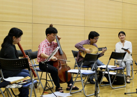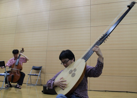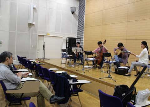 当日券少しだけあります。 いよいよ明日に迫ったほぼ日の学校スペシャル シェイクスピアの音楽会。 講師の河合祥一郎さんと、演奏者のみなさんの最終打ち合わせが行われました。 シェイクスピアの劇中に使われた歌や器楽合奏が次々と奏でられ、聴いているわたしたちは、ひととき心を17世紀に遊ばせました。 休憩時間に、リュート奏者の坂本龍右さんがみせてくれたのが、リュートの仲間で、フランスとイタリアで使われていたテオルボという楽器。 ヴィオラ・ダ・ガンバの中山さんとミニセッションが始まりました。 指先から自由に音楽が出てくるって、本当にすてきです。 あ〜、ずっと聴いていたかったなぁ。 2018/05/28 17:38 |