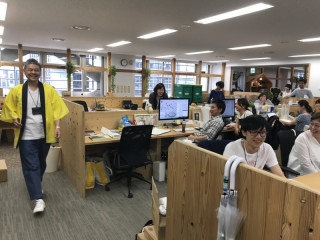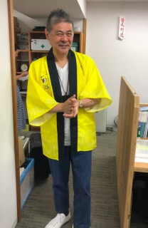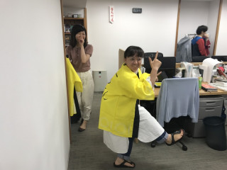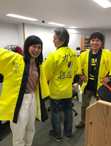 カレーの恩返しオシ。 視界にまぶしいものがとびこんできました。 なにかはげしくおされている気がするのですが、笑うしかありません。 笑っていた人が着てみたくなるのがこのハッピの魔力なのでしょうか。 いろいろなひとがハッピをまとっていきます。 もちろん ハッピを着て、社内をまわりはじめると拍手がわきおこります! なんの拍手かわかりませんがさすがです。 こんなゆかいなひとたちに 生活のたのしみ展で出会ったらぜひカレーの恩返しを買ってください。 きっとおうちのカレーがますますおいしくなります! 2018/05/30 17:22 |
