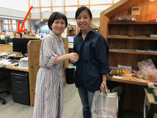 山さん 私の尊敬する山さん( 山さんは「生活のたのしみ展」のメイン担当で、いついかなる移動のときも 「運べるものを運ぶ」姿勢で、最後の最後まで手になにか持っていました。 山さん、おつかれさまでした。 最後にレジ王 もうひとりの担当の みついちゃんも、ほんとうにがんばってずっと手に金槌かメジャーを持っていました。 そういう神様に、いつかなるのではないでしょうか、と思いました。 おつかれさまでした。 それはそうと、こういう 「おつかれさま」的な写真を撮るとき、バックにたいてい、それをほこらしげに見つめている乗組員が写り込むんですよ。 それが私は、結構好きです。 2018/06/12 15:46 |