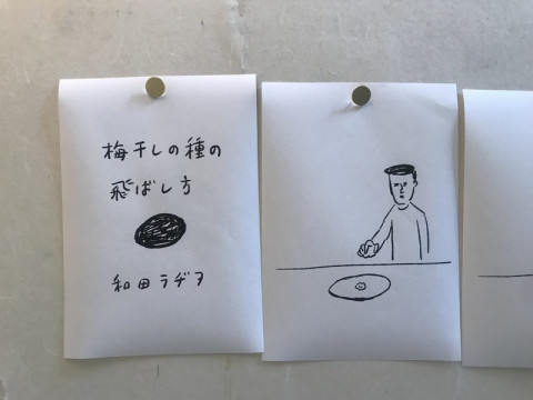 梅干しワークショップ祭り。 今日から、TOBICHI2では、 「5つぶの梅干しをつくる会 2018」を開催。 「5つぶの梅干しをつくるワークショップ」、 「梅干し喰い比べワークショップ」、 「美味しい梅茶漬けづくりのワークショップ」、の3つに参加できますよ。 ワークショップといっても、事前の申込みは不要だそうで、行けばその場で申し込み&参加が可能でした。 そして、もちろん梅干しや梅干しのおかし、梅シロップ、梅ジャムなどなどのお買い物、さらにはお茶漬け用品も販売中。 「生活のたのしみ展」で大好評だった海大臣のふりかけもあった! ご飯にかけるだけでなく、ビールのおともにするあれですよ。 そして、ギャグ漫画界の重鎮であり、2016年「梅干しの種飛ばし」 砥部町七折梅祭り・男性の部優勝 (記録11m10cm)の実績をほこる和田ラヂヲ先生の梅干しの種の飛ばし方の漫画も読めます。 あ、先生が実際に種を飛ばす実演ビデオも観られます。 実際に自分で飛ばしてみると、ビデオの内容がよく頭にはいると (種を飛ばす際は、場所や周囲に気をつけ、飛ばしたあとは種をきちんと片付けてネ) 日曜日まで開催中なので、お時間あればぜひどうぞ〜〜! 2018/06/21 15:34 |