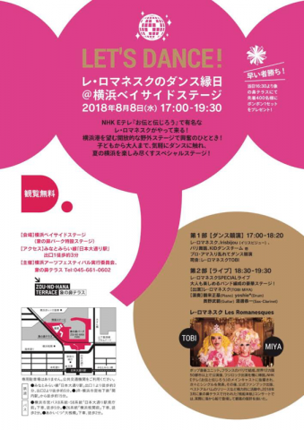 レ・ロマネスクが無料ライブ! レ・ロマネスク、真夏の出演情報です。 きたる8月8日(水)、ヨコハマの「象の鼻テラス」のあたりに1500名くらい着席できるでっかいステージが出現するんですけど、そこでライブを行います。入場無料!です。 名付けて「レ・ロマネスクのダンス縁日」。 夏っぽいですね。 ただ、夏だからといって、ふたりは弱音を吐きません。 いつものとおり、汗吸わない&風通なさいピンクの衣装で歌って踊り切るそうです。 ダンス縁日というだけあって、踊れるチューンばかりをやる予定です。 平日の夜ですが、無料ですし、レ・ロマネスク気になってたけど‥‥という人、ぜひ、お集まりください。18時30分から。 浴衣を着てきてもたのしいし、お子さまと一緒に踊るのも、いいと思います! (私もギター係として端の方にいます) 今回は、いつもの凄腕バンドメンバー (自分以外)に加え、サックスの渡邊恭一さんも加わります。 そうです「生活のたのしみ展」のときの前川清さんのコンサートにも出ていらした、一流のミュージシャンです! 前からレ・ロマネスクのファンでライブも見にきていたそうです。すごい〜。 くわしいことは、イベントの公式ページでチェックしてみてください。 あ、あと、人気の連載だった 「レ・ロマネスク TOBIのひどい目」 が本になります! たぶん9月くらいに。 まだ、お見せできるものが何もないのですが、ニセ情報ではありません。 ひとまず、お知らせしておきます! 2018/08/02 12:16 |