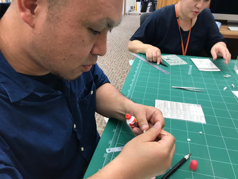 もとっても小さな部品に爪楊枝で接着剤をつけて集中しています。