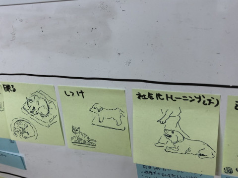 タナカさんと犬猫 ふだん私の隣に座っているドコノコチームの それは、 置いてある本も犬猫に関するものばかり。 ふせんにも自分で描いたと思われる犬猫のイラストが。 (しかもかわいい) そんな 「田中ワンワン」と紹介されていまして それを読みながら笑っていると、 「だって、顔アイコンも犬だからね。 それでさ、見て、このサイン」 わ‥‥ほかのみんながハンコを押して回覧している資料に、 おもしろいなあ。 「たのしみ展」に行かれるみなさま、田中ワンワンさんを見かけたらぜひ犬猫の話をしてあげてください。 2018/09/21 14:30 |
