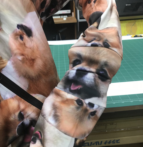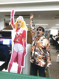派手なお客さま 浅生鴨さんが社内を歩き回っています。 あれ、パーカーの柄、ポメラニアンの集合…!? 歩く先々で「すごい柄!」 「わはははは!」と大反響です。 「うちの犬(黒いポメラニアン)がその服見たら、吠えるよ!」と笑いながら 袖をつなげるとひとつの顔になったり、なんだかもうどこまでも奇天烈なのです。 わたしが今まで見た中で、一番派手な洋服かもしれないなあ。 その後、 TOBIさん(の等身大パネル)と写真を撮って、鴨さんは次の予定に向かっていきました。 目に映る要素がたいへん賑やかなひとときでした。 2018/09/26 17:19 |