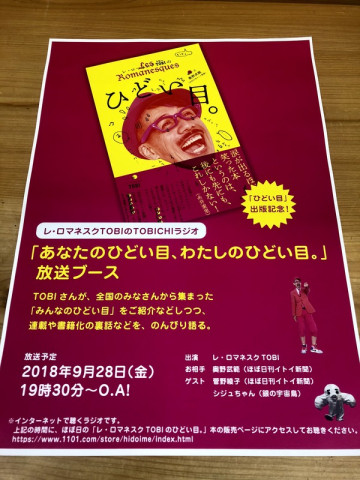TOBIのTOBICHIラジオ。 レ・ロマネスクTOBIのひどい目。展、あす28日(金)からです。 いま、TOBICHIチームがデザインチームが形にしてくれた展示物を会場に持っていってどんどん、設営してくれています。 さらに、ほぼ日システムチームがTOBICHI2の一階に、あす28日「19時30分」からオンエアする 「TOBIのTOBICHIラジオ」の放送ブースをつくってくれております。 みんな、たのもしい! このブースから、TOBIさんと、進行役のわたくしに加え、特別ゲストとして ともに、TOBIさんとはなかよしの間柄。 シジュちゃんなんか、レ・ロマネスクのライブに出たこともあるんですよ。テルミンで。 (証拠映像は、こちら。) かんじんの放送内容はというと、全国のみなさんから集まった 「わたしのひどい目」をご紹介したり、連載や書籍の裏話などを、いろいろ、お話したいなと思ってます。 ポップコーンでもつまみながらまったく気楽にお聴きいただける内容です。 金曜日の夜、ぜひ、お楽しみください。 こちら書籍「ひどい目」の販売ページに、ラジオを聞くための小窓が出現します。 2018/09/27 14:40 |
