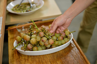 がおやつテーブルの前で、頭から「♪」の吹き出しを出すようにして長いこと何かを食べているので行ってみると、そこにはいただきものの葡萄がありました。