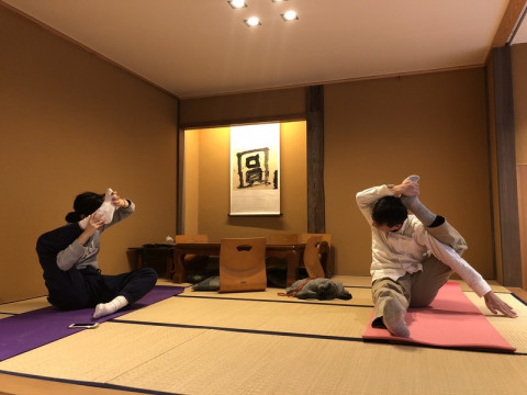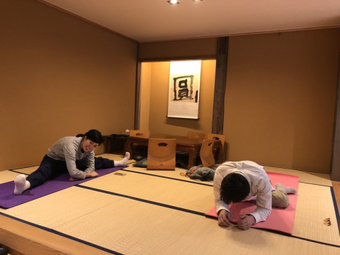 今日の柔軟部。 いずれコンテンツになるようにがんばっている柔軟メンバー、自分たちで「柔軟部」と名前をつけて、毎日、ちょこちょこ活動しています。 今日はメンバーが少なかったですが、もともと柔らかい2人と一緒にやっていたら、すごいことになっていたので、ギョッとして写真をとりました。 ( 「両足180度パタン」だそうです。 高いハードルながら、あしざわならいけるかも、という気がします) とりあえず、それぞれに自分の限界を越えようと、柔軟部、毎日がんばっております。 1週間坊主とかになりませんように‥‥。 2018/12/06 14:13 |