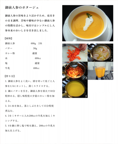 その3:御前人参 この人参、畑から掘り出したものをその場で、シャクッとかじらせてもらったことがあります。 もちろん人参なんですけど、その甘みと食感で、なんだか柿をかじってるような感覚。 これをジュースにすると、絶品なのです。 よくある「にんじんジュース」ではない、フルーツジュースのような、甘さ。 ぜひ、ためしてみていただきたいです。 あ、そうだ。そういえば、ポタージュもいただいたことがある。 あれも、おいしかったなあ。 急に思い出しました。 郡山ブランド野菜ボックスのお申し込みは、 こちらのページからどうぞ。 2018/12/06 19:28 |