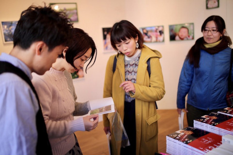 写真好きのお客さまのつくったお手製の写真集を見る梅さん。