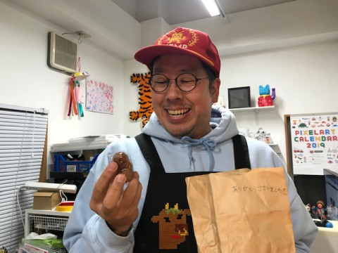 ハラマキもよろしくね! 大図まことさんといえば、本日から販売がはじまった 「ほぼ日ハラマキ」も、どうぞごらんください。 大図さんのデザインしたハラマキは、 「MOTHER2(私がもってるほう)」と 「未確認生物と不思議な世界(大図さんがもってるほう)」 です。 もんのすごくかわいいんです。 ファッション的にもグー! いいっ。 じつは、ハラマキのページデザインが斬新すぎて、ページチェックのときに、大図さんはコーヒーを吹き出したそうです。 (3枚目の写真がそのようす) よかったね、担当の廣瀬さん。 帰ろうとしたら、最後に、さっきの小学生からもらった人形焼きをくれる大図さんでした。 来年からここTOKYO PiXEL.は、 (1月9日から営業開始) 水〜日営業となります。 (現在は金土日営業。年内は24日まで) なんと「ほぼ毎日会える大図」状態です! 明日土曜日は、店内からニコニコ放送のイベントがあるそうです。 くわしくはTOKYO PiXEL.のホームページをごらんください。 2018/12/14 18:16 |