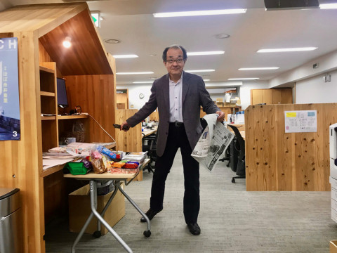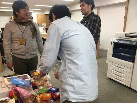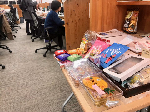 おやつテーブル 休みあけにはおみやげが集まることを昨日も投稿しましたが、我が社の通称「おやつテーブル」はおみやげやお年賀でいっぱいになっています。 「○○に行ってきました」 「××に寄ったので」 なんてメモもそれぞれ添えてあります。 みんなが通りすがりに 「お、こんなお菓子があるぞ」 ってなかんじでたのしそうにチラッとのぞいていくのがおもしろいです。 河野さんもおやつをチェックしにきたのかな? いえ、新聞を取りにきたのでした。 気になるニュースがあったみたいです。 2019/01/08 20:01 |