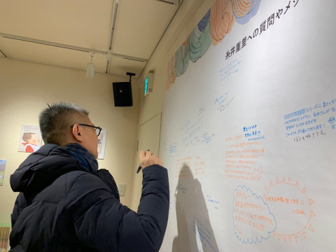 返事を書く糸井重里。 先程からTOBICHI2では 「小さいことば堂スペシャル」の糸井重里が来場者の質問に直接答えるイベント 「糸井重里インタビュータイム」を開催中。 (お席は事前申し込み、抽選) 会場に着いた糸井は、まずは壁の質問コーナーにお返事を一気に書いていきます。 そして、開始時間が来たので二階へ。 書かれたお返事はTOBICHI のツイッターでもこの製作中でものちに紹介予定です〜。 小さいことば堂は11日まで。 壁にはどなたでも糸井への質問を書いていただけますので、よかったらぜひー! 2019/02/03 19:55 |
