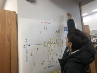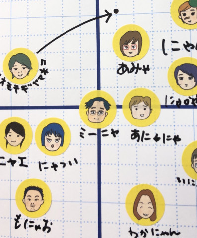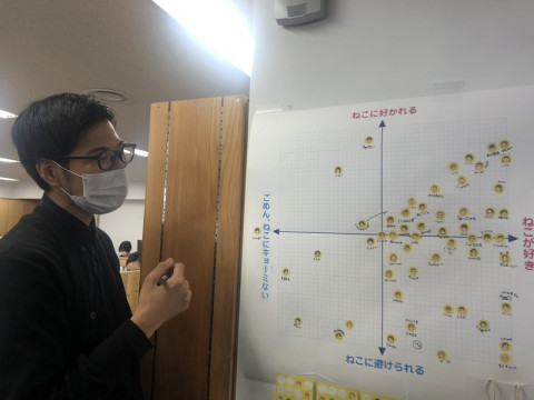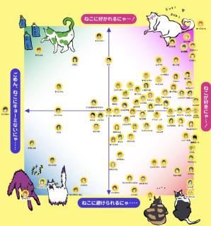 ねことの関係 今日は、いろんなねこのコンテンツがありますが、ひそかに気に入っているコンテンツが、こちらの相思相愛グラフ。 乗組員がねこについて、どう思っているのか、関係性を(意味なく)グラフ化しました。 調査は、わりとアナログで、紙を用意して、みんなに 「ここ!」と貼ってもらったのです。 ねこの日だからって、ねこが好きな人ばかりじゃなくて当然で、 (そのほうが自然ですよね) それもそのままグラフ化してあります。 好きだけどアレルギーだ、とか、いろいろありますし。 2013年に同じように、 乗組員のねこ度を作った際、ねこ好き度が 「ふつう」だった 「あまり興味ない」だった 「実は最近好きになって」と報告してくれたり、ねこに対する気持ちも変化していくものだなーと感じてます。 そして、ねこが自分をどう思っているかということも、真実はわからないはずですが、 「自分はねこに好かれている!」となぜか自信満々に思っている面々や、 「ねこが好きだけど、ねこに好かれてないかも‥‥」と遠慮がちに語る面々など、 いろんな性格がでていておもしろかったです。 あと、今回のネコネームは、あくまで自己申告制です。 原型がわからない人も多数おります。 個人的には、通りすがりの 「あ、自分の名前をネコネームにしてくださいね」と言った際、 さっとペンを取り、筆圧強く、 「ミーニャ」 と書いて去っていった瞬間に、なにか言いようのないすごみを感じました。 相思相愛グラフはこちらから 2019/02/22 14:13 |