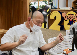 「ねこ手」で踊りながら中継。