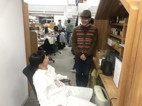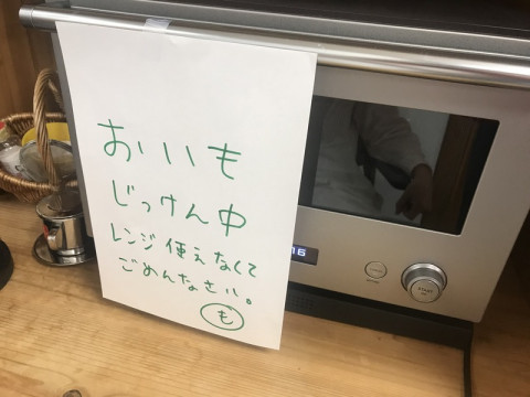 おいもばん 「ドレルギー?」トークの少し前のこと。 こちらが 「おいしい焼き芋の会」の試作風景です。 オーブン前に椅子を置き、ドンとすわっている なかなかの存在感だったので、何の気なしに聞いてみたんです。 「どれぐらい時間かかるの?」 「1時間だけど、30分したらお芋を裏返すのでここで見守ってる!」 「え? ずっと?」 「そうそう。なにがあるか、わかんないからね。 こうやって手ぶらで座っている先輩がいるとみんな気楽でしょ笑!」 たいへんおおらか、かつ仕事が丁寧な先輩ですが、焼き上がったときに OYATSU GUNTEをはめてあっつあつの焼き芋をもっていたのは 先輩、どこ行っちゃたんだろう・・・ お芋、ホクホクで甘くてたいへんおいしかったです。 週末、TOBICHIで召し上がってください! 2019/03/13 10:09 |