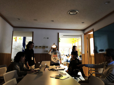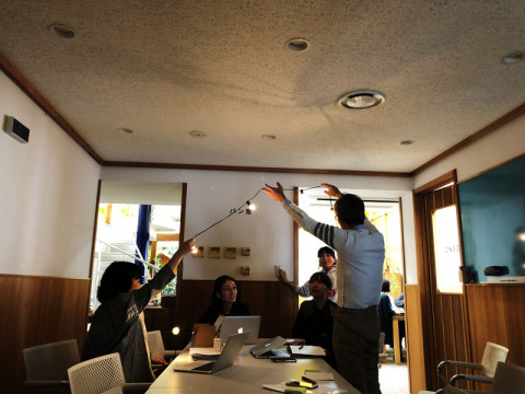ムーディー打ち合わせ ミーティングスペースがすべて埋まっていたので、長い机のあるスペースの端と端に座って、2つのチームで打ち合わせをしていました。 机が長いので、声はあまり気になりません。 案外これはこれで問題ないなあ‥‥。 と思っていたら、ぱた、と部屋の電気が消えました。 「あれ、停電?」 と見ると、向こうのチームがきれいな電球を掲げていました。 あらまぁ、きれい‥‥。 「第4回生活のたのしみ展」の、照明を考えるミーティングだったようで、 「急に消してごめん」「ごめん」 「ごめんごめん」「ごめんー」 とみんなから言われましたが、ちょっと異世界に入り込んだようでたのしかったです。 いま、たのしみ展の準備がどんどんすすんでいることが、社内のあちこちから伝わってきています。 いやー、もうすぐだ。 ちょっとドキドキするなあ。 2019/03/25 17:56 |