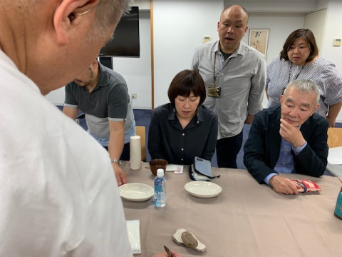 塩野米松さんといっしょにごはんを食べて、食後にみんなで化石を見ているところです。