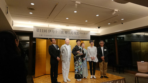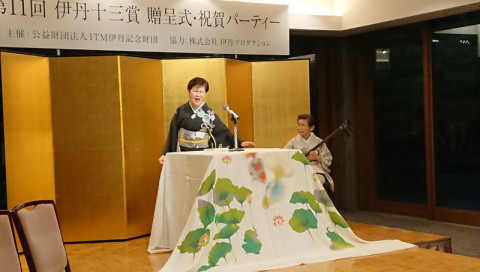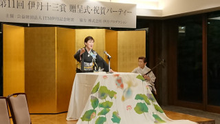 第11回伊丹十三賞! だいぶ前のことで、申し訳ありません。 先月4月26日、 第11回伊丹十三賞の贈呈式にうかがってきました。 今回の受賞者は、浪曲師の玉川奈々福さん! 受賞理由は 「現代の観客のこころを動かす語りの芸と、浪曲に新たな息を吹き込む卓越したプロデュース力に対して。」 そう書かれているとおり、浪曲師として自身の舞台を精力的にこなす他、様々な浪曲イベントを成功させている、たいへん人気の方です。 「ほぼ日」とのご縁としては、昨年、「ほぼ日の学校」の対談に登場してくださいました。 ※「出版社をやめて浪曲師になりました。」 玉川奈々福さんは、もともと、新潮社、筑摩書房とお勤めになっていた編集者で、志村ふくみ先生のご本などを担当されていたそうです。 そういったわけで、 「ほぼ日の学校」学校長の河野とも、旧知の仲。 みんなでお祝いにうかがったのでした。 奈々福さんが伊丹十三賞の受賞のことばをのべられる段になると、壇上には演台が登場! いつものように力強く、かつおもしろい浪曲を、曲師の沢村豊子師匠の三味線で唸ってくださいました。 玉川奈々福さん、おめでとうございます! (受賞コメントはこちら。 伊丹十三記念館による詳細なレポートはこちら。) ちなみに玉川奈々福さん、明後日の23日(木)、大阪で、こちらも「ほぼ日の学校」に登場してくださったことのある桂吉坊さんと、二人会をひらかれるそうです。 詳しくはこちらをご覧ください。 2019/05/21 20:24 |