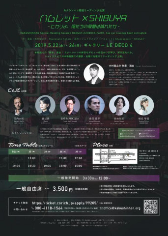 演出家・木村龍之介さん率いるシアターカンパニー・カクシンハンのリーディング公演 「ハムレット×SHIBUYAヒカリよ、俺たちの復習は穢れたか」を観てきました。 この作品は、2012年のカクシンハンの旗揚げ公演のために、木村さんが脚本を書き下ろした記念すべき作品で、このほどイギリスで翻訳・出版されるのにさきがけて東京で上演されました。 リーディング公演なので朗読です。 とはいえ、そこはカクシンハン。 もちろんふつうの「朗読」ではありません。 役者さんは台本を手にし、スペースや動きは限られたもの……なのですが、舞台セットや大きな移動や動きがないぶん、かえって想像力が刺激され、ラブホテル「エルシノア」での緊迫したやりとりや、SHIBUYAとAKIHABARAの切迫したかけひきは、舞台に勝るとも劣らない迫力でした。 シェイクスピアを愛してやまない木村さんが、「ハムレット」を大胆にとりいれながら、東日本大震災直後に書かれた古川日出男さんの『馬たちよ、それでも光は無垢で』にインスパイアされて書いた本作は、木村さんにとってもカクシンハンにとっても大切な作品。 それを生で体験するチャンスです。 公演は5月26日まで、渋谷で行われています。 まだお席のある日もあるそうです。 ぜひお運びください。 2019/05/23 17:59 |