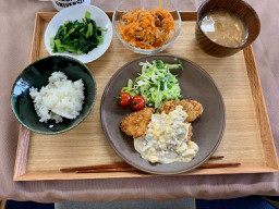 今日の給食はカジキマグロのフライしばづけタルタルソース、でした。