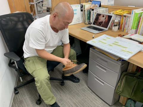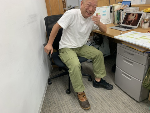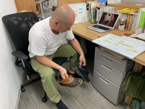 雨靴。 さっき、わたしは 「なんかあるきにくいとおもったら靴が左右で違いました。」 という報告をもらった。 もらったからには、見に行くしか無いじゃないか。 その靴が左右逆なところを。 それで会社にきたんだったら相当だし。 鼻息荒く席までいったら 「そんなに面白い話じゃなくて、今日は雨だから雨靴できたんだけど、むれるから、会社の置き靴に履き替えたんだけど片方しか履き替えなかったってだけですよ。 家から左右別々できたわけじゃないです。」 ‥‥なんとも半端な情報だ! しかたがないから、いま、はき直したところ悪いけど再現してほしいです。 なんか、行き所がなくなった情報をどうにかするために。 ああ、 強引にまとめて、連休明けの雨の降り続く青山の事務所の風景をお送りしました。 2019/07/16 11:54 |