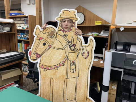 馬、アゲイン。 リメンバー・ディス・ホース? おぼえていますか、この馬。 「ひとり古墳部」のスソアキコさんが描いてくださった埴輪の馬です。 スソさんが「TOBICHI」で 「古墳と山高帽展」をしたときに登場した馬です。 当時現場では、多くの人がこの馬から顔をだしました。 この馬が、大阪に向かいます。 パカラッパカラッ。 なぜかといいますと、スソアキコさんがうめだ阪急百貨店10Fスーク 中央街区1番小屋・文具売場で7月31日(水)〜8月6日(火) のあいだ開催される 「古墳はにわフェス」に登場するからです。 馬は応援に駆けつけます。 スソさんのブースのタイトルは 【スソアキコの『ひとり古墳部』部活展】です。 スソさんの「ほぼ日」での活動を報告する展示となっております。 新作の「ひとり古墳部」特製箔押しシールやおなじみ、「土偶ピンバッヂ」などが出品されております。 そこに、馬が応援に駆けつける、というようなことです。 関西地区にお住まいのみなさま、ぜひ、馬から顔をだしていただけたらと思います。 ほかの埴輪も応援に駆けつけたいところですが、スペースの都合で馬のみです。 すみません。 2019/07/18 17:19 |