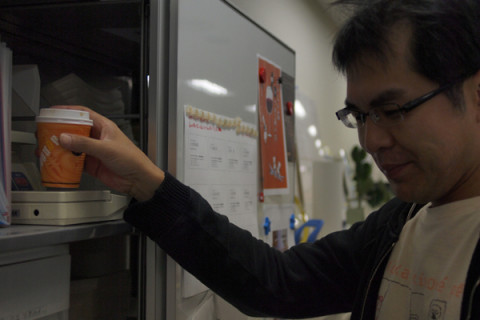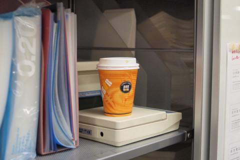 封筒を取りに行ったら郵便物用の秤の上になぜか、ドトールコーヒーのMサイズのカップが‥‥