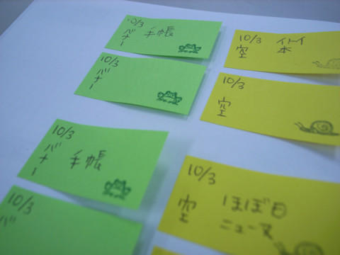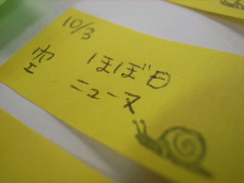 さまざまなミスが 永田です。 ほぼ日刊イトイ新聞の翌日のメニューの並びを決める通称「朝のシャッフル」があることはしばしばお伝えしていると思います。 そしてその結果が、メールのほかに、 「ふせん」によって担当者に知らされるというアナログな事実も過去にお伝えしたかと思います。 で、この「ふせん」に決定事項を表記する段階で、ふせん係の 今日はまず「ニュース」を「ニューヌ」と。 さほど大きな「まつがい」じゃないですが、その言葉のマヌケな響きに笑っていると、土曜日、日曜日、月曜日の3日分の「ふせん」の日付が、すべて10月3日になってて一同驚愕しました。 週末を控える金曜日の「ほぼ日」はいつもよりちょっとだけばたばたします。 2009/10/02 12:39 |
