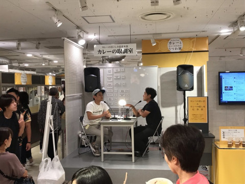 盛り上がってます。 「カレーの恩返しカレー」販売のため、阪急うめだ本店の 「カレーとカレーのためのうつわ展」にでかけている 『お客様の数がすごいです。 となりのお店のレトルトカレーの品揃えや独創的なメニューなど行ってみたいお店がたくさんあります。 水野仁輔さんの取調べのイベントも始まりました』 たくさん写真を送ってもらったのですが、なんだか熱気がすごいです。 これはちょっと行ってみたい‥‥。 そして水野さんのラジオ、 「カレーの取調室」と名付けているだけあって、こんな場所でおこなうんですね。 週末、 盛り上がり中の 「カレーとカレーのためのうつわ展」、みなさま、ぜひぜひ足をはこんでみてください。 (カレーの恩返しブースのみんな、おつかれさま!) 2019/08/28 13:57 |