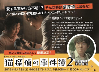 「猫探偵の事件簿2」放送のお知らせ ペット探偵というシゴトをご存知ですか? 迷子になった犬や猫を捜しだし、捕獲し、おうちに帰すおシゴトです。 ドコノコ迷子掲示板のサポートをしている 「ペット探偵プチ弟子入り」をしております。 このたび、藤原さんをモデルにしたドキュメンタリードラマが放送されることになりました。 人と猫との深い絆を描いた実話ドラマ 「猫探偵の事件簿2」。 9/14 15:30 NHK BSプレミアム 「猫探偵の事件簿」再放送 9/18 22:00 NHK BSプレミアム 「猫探偵の事件簿2」 ぜひお見逃しなく! 2019/09/13 11:10 |